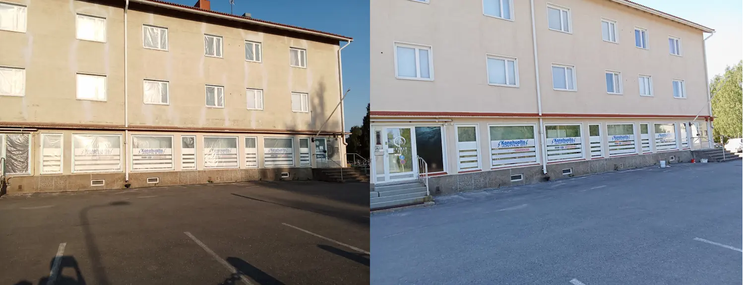 Sisäpuolen laajat tasoitetyöt ja modernin liikekeskuksen julkisivumaalausurakka.